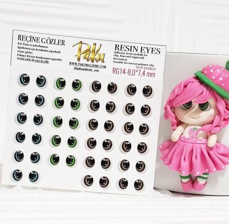 Adhesive resin eyes for polymer clay dolls or fondant figurines. Resistant to heat, so you can bake with your clay craft in the oven. Not edible.